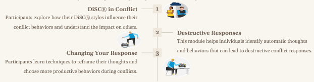 Everything DiSC® Productive Conflict is a learning experience designed to enhance individuals’ self-awareness about their conflict behaviors. Rather than providing a step-by-step conflict resolution process, it integrates personalized insights from the DiSC® model with cognitive behavioral theory. This approach helps participants recognize and transform destructive habits into more constructive responses, enabling them to navigate workplace conflicts more effectively.